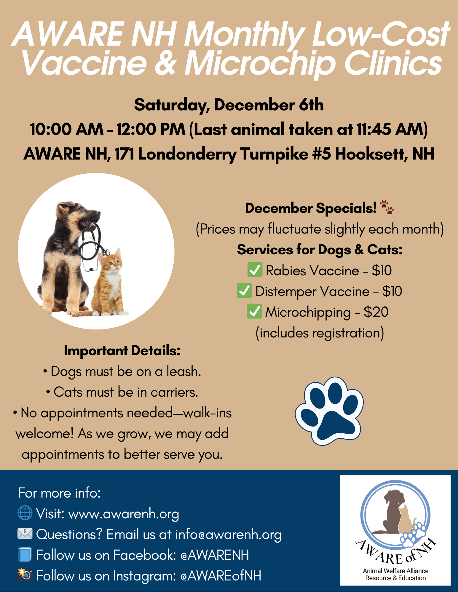 AWARE of NH Hooksett 171 Londonderry Turnpike, #5, Hooksett, NH, United StatesEvents Details When: First Saturday of every month Time: 10:00 AM – 12:00 PM (Last pet accepted at 11:45 AM)No appointments needed—just walk in! Venue Details On the first Saturday of most months, we offer affordable vaccines and microchips to help keep your pets happy, healthy, and safe. Services & Pricing* for Cats & Dogs […]